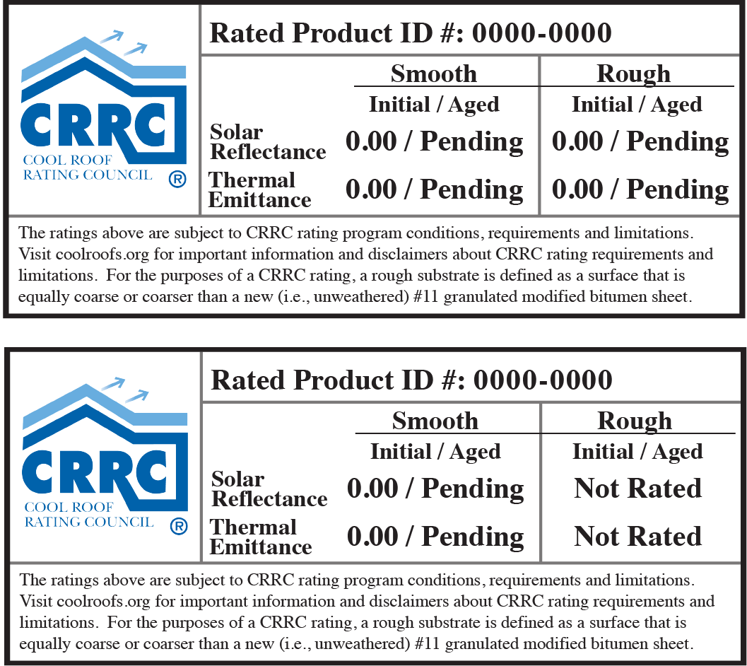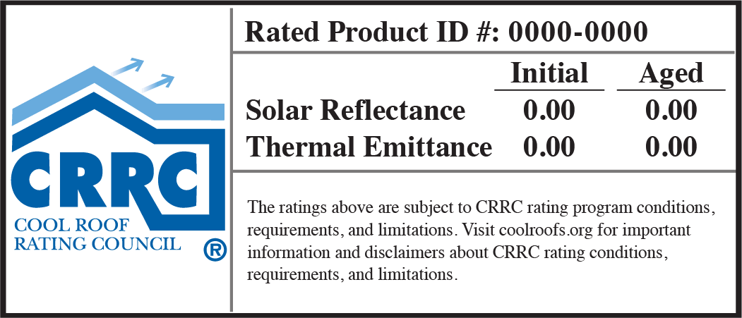 The CRRC Product Label is intended to convey a product rating for a CRRC rated product that is sold for final installation or application. The CRRC Product Label may only be used on products or product packaging by CRRC Licensees. Use of the CRRC Product Label on products, product packaging, product literature, and product specification sheets for products that are not CRRC rated is strictly prohibited.